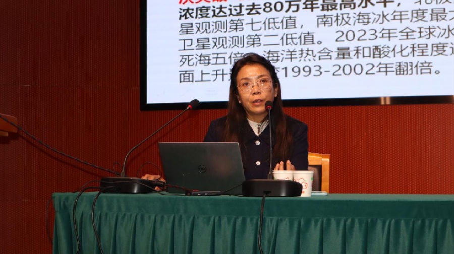 在讲座中,张红教授结合详实数据与案例分析了全球气候变化的严峻现状,并介绍了中国在“双碳”目标引领下的生态建设成效。她指出,中国正以坚定担当守护绿水青山,而这背后正是抗战精神中坚韧担当的当代传承。讲座最后,张红教授强调生态文明建设这一“持久战”,与80年前的民族救亡之战有着精神共鸣,抗战先辈以“不畏强暴、血战到底”的气概赢得了民族独立,今天的我们更需传承这份精神,以久久为功的坚守应对生态挑战。王轶副馆长在总结中呼吁全校师生应争做生态守护者,将抗战精神转化为绿色行动的自觉,用点滴努力汇聚成生态保护的强大合力。