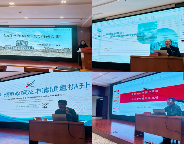 今年是中国人民抗日战争暨世界反法西斯战争胜利80周年。80年前,无数先烈以鲜血铸就民族脊梁;80年后,我们以传承赓续奋斗精神。为将这份精神融入科研创新,打通科研成果转化“最后一公里”,强化师生知识产权保护意识,11月13日,山西医科大学图书馆与科学技术部联合主办的知识产权系列讲座在图书馆B105学术报告厅顺利举行。系列讲座分上下午两场开展,各院系师生及科研人员代表共计100余人全程参会,活动由图书馆李雪琴副馆长主持。 上午场讲座特邀太原理工大学图书馆知识产权信息服务部主任、情报学博士付鑫金研究馆员主讲。付老师以《知识产权信息助力科研创新》为题,聚焦知识产权保护意识培育核心,通过大量丰富有趣的案例,生动拆解专利检索关键技巧与多元知识产权信息获取,有效强化了师生的知识产权保护与应用意识。 下午场“专利申请实务与高价值专利培育”系列讲座中,三位知识产权领域权威专家接续带来精准化分享,内容兼具理论高度与实践价值。国家知识产权局专利局太原代办处副研究员李永翊以《从实验室到临床:医疗领域高价值专利培育》为题展开分享。她指出,医疗成果从实验室走向临床,专利布局需前置化,要精准把握技术核心与市场需求的结合点,其深厚的理论功底与鲜活案例赢得在场师生阵阵掌声。山西省知识产权保护中心国家专利预审员郑会海聚焦《专利预审政策及申请质量提升》主题,为师生解读了专利预审的最新政策导向。他重点分析了高校科研项目在专利申请中常见的材料撰写不规范、流程把控不到位等问题,结合自身专利审查经验给出了提升申请质量的具体建议及专利预审申报的关键要点,为师生提供了实用操作指南。北京佐行律师事务所高级合伙人李熙平则从法律实践视角,以《专利授权率提升策略与非正常申请风险规避》为核心进行分享。针对师生关注的非正常申请问题,详细解读了判定标准与规避方法,强调专利申请需兼顾创新性与合规性,帮助师生树立了“保护在先、规范在先”的知识产权意识。